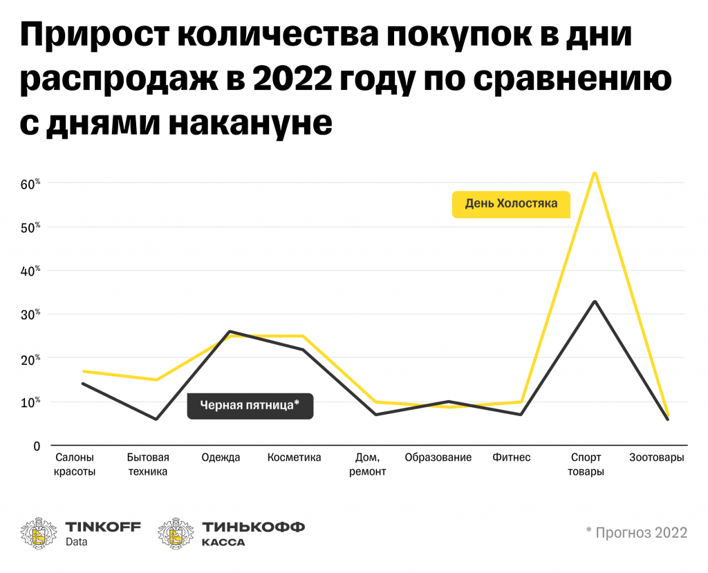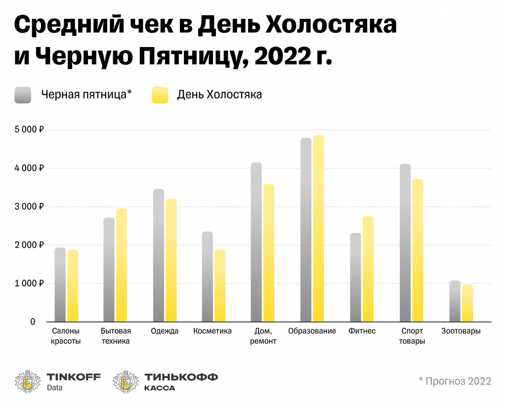 Для Черной пятницы характерен сильный рост среднего чека в категориях "Косметика" (16% согласно прогнозу на 2022), "Фитнес" (10%) и "Одежда" (7%).