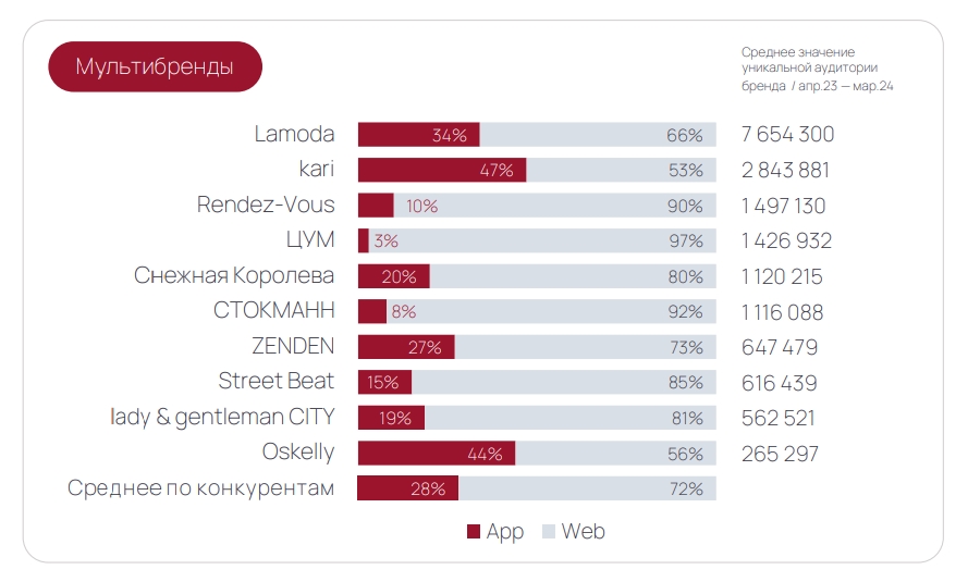 ● У некоторых брендов брендов доля app-аудитории стремится к 50%: kari - 47%, Oskelly - 44%.