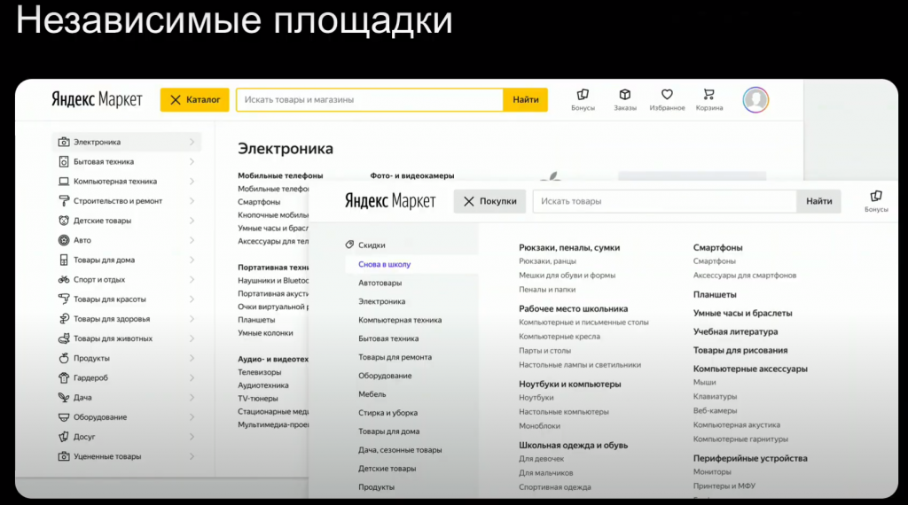 Важно, что сервисы после объединения продолжат существовать достаточно независимо. Например, если пользователь будет осуществлять поиск на площадке "Яндекс.Маркет", то он будет в результатах поиска оказываться на "Маркете". Если он начнёт искать товар в рамках раздела "Покупки" (ex-"Беру"), то попадет на результаты поиска в товарной выдаче раздела "Покупки", там, где будут предложения, доступные к оформлению прямо сейчас. То же самое касается навигации по "товарному дереву".