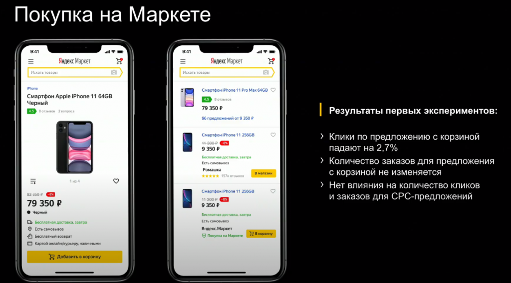 Важное добавление. Запуск раздела "Покупки" не повлияет на ранжирование выдачи в "Маркете". Клики в рамках запуска у наших партнёров не падают, трафик на площадки вендоров не изменяется. Единственное, где будет возможность купить товар прямо на "Маркете" - это на текущих местах предложений "Беру". Напомним, что "Беру" размещалось на "Маркете" через аукцион, при этом мы очень тщательно и даже жестко следили за юнит-экономикой "Беру", поэтому ни о каком "первом принудительном месте в выдаче" речи не идёт.