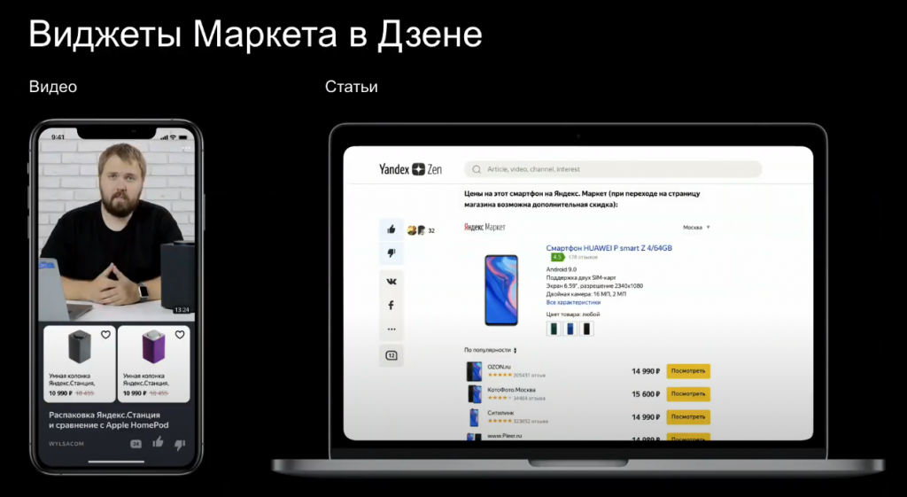 Мы запустили товарные виджеты "Маркета" в "Дзене". Уже доступны несколько их видов. Это и видеообзоры, и типичные блоги с ценами в текстовых подборках и прочее. Далее мы будем внедрять всё новые форматы, тестировать возможность оформить заказ товара прямо находясь в ленте "Дзена".