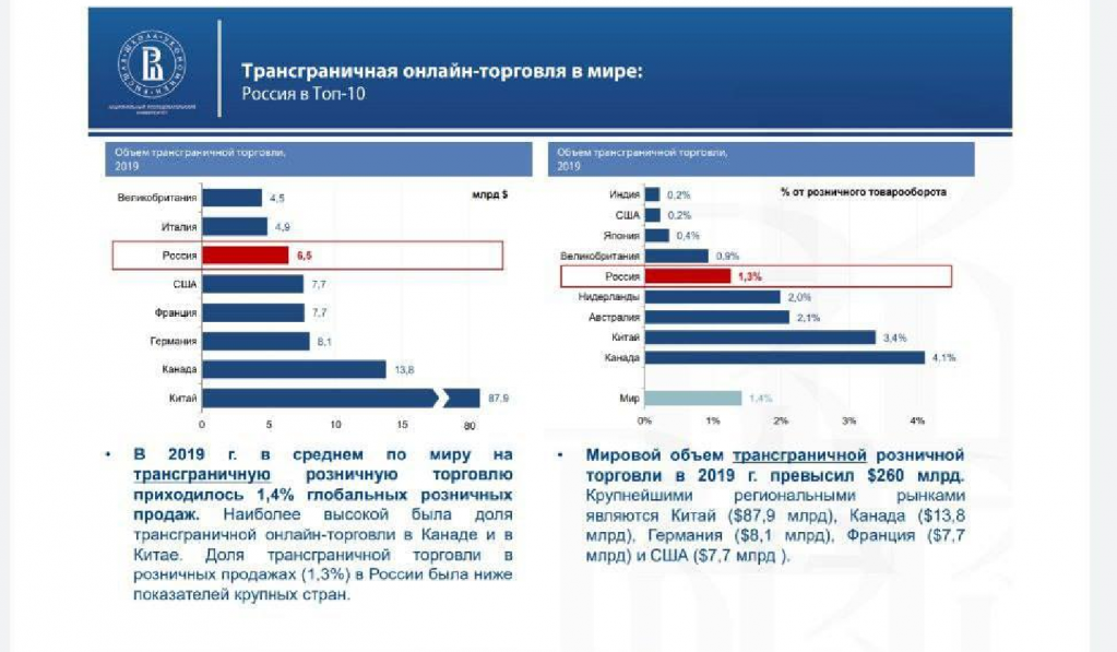 Эксперты из Высшей школы экономики оценили, что объем товаров, отправленных россиянам из-за рубежа, в 2019 году составил $6,5 млрд. По оценке "Почты России", более 90% иностранных отправлений прибыло из Китая, большая часть которых была вызвана онлайн-заказами через AliExpress Россия.