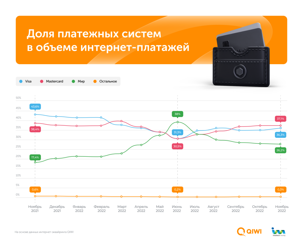 За 2022 год доля карт "Мир" выросла до 26,2% в объеме интернет-платежей: исследование QIWI и IntellectMoney. Провайдер финансовых сервисов QIWI и платежный агрегатор IntellectMoney изучили, как изменился оборот по картам платежных систем Visa, Mastercard и "Мир". Согласно исследованию, если в ноябре 2021 г. доля карт "Мир" в общем обороте составляла 17,4%, то к ноябрю 2022 г. она выросла до 26,2%. Аналитика основана на данных интернет-эквайринга QIWI.