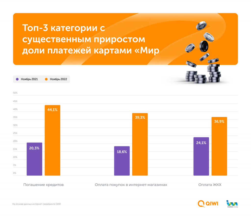 Среди категорий, где заметен существенный прирост доли интернет-платежей с картами "Мир", оказались погашение кредитов (рост с 20,3% до 44,1% с ноября 2021 г. по ноябрь 2022 г.), оплата покупок в интернет-магазинах (с 18,6% до 39,3%) и оплата ЖКХ (с 24,1% до 36,9%).