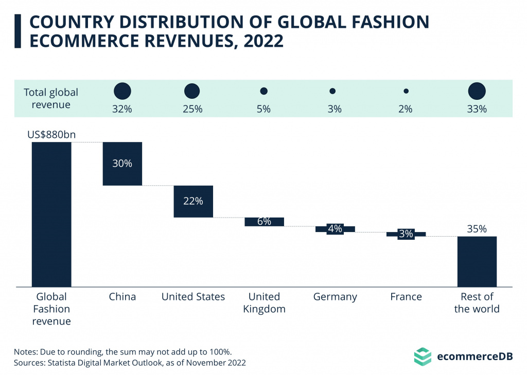Доля Китая в мировом рынке fashion-eСommerce составила в 2022 году порядка 30%, говорится в отчёте Statista Global Consumer Survey. На втором месте США, онлайн-продажи там составляют 22% от общемировых. На третьем месте, с огромным отрывом, идёт Великобритания (6%).