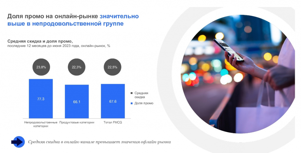 По данным NielsenIQ, за последние 12 месяцев доля продаж товаров повседневного спроса по акциям выросла на 3,6 п.п. до 48%. Особенно активный рост наблюдается в онлайне, где средняя доля промо в деньгах к июню 2023 года почти достигла 70%. Одновременно с этим на протяжении года увеличивалась и глубина скидки, составив 22,5%. Для сравнения: в офлайне величина промо падает, год назад средняя скидка составляла 23%, то сейчас уже не дотягивает и до 20%.