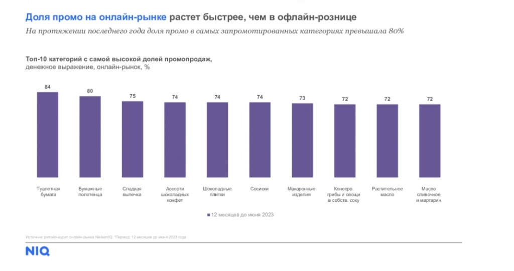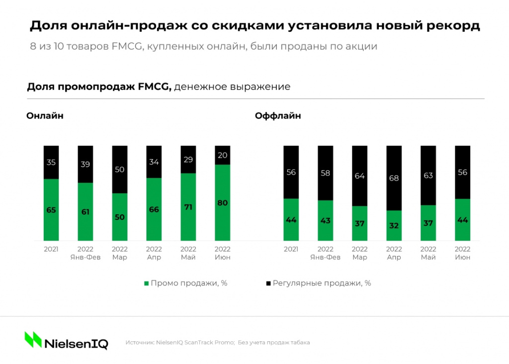 В июне, по данным NielsenIQ, доля продаж по промо в онлайн-магазинах побила рекорд за все время измерений: 8 из 10 товаров FMCG в интернет-магазинах были куплены по акции.