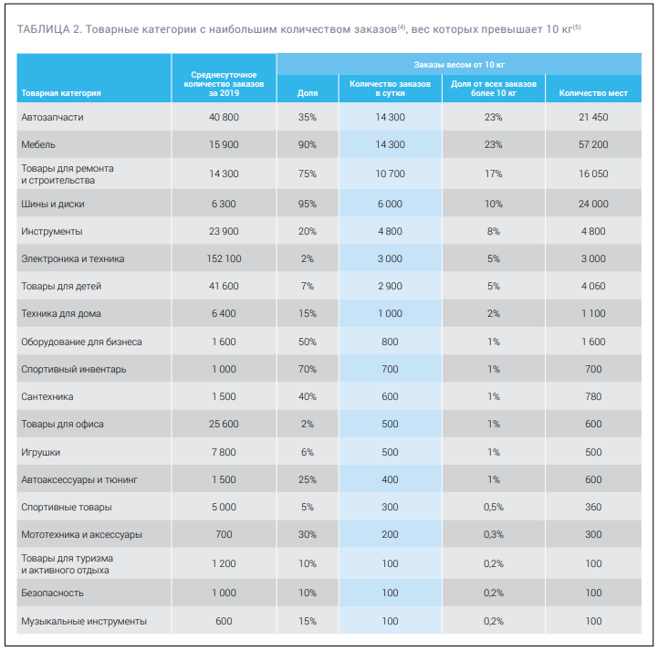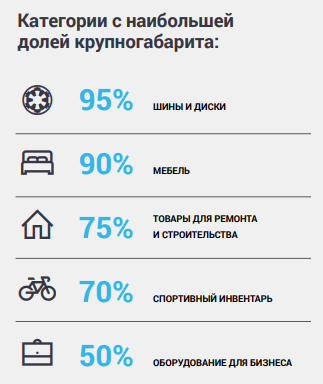 Крупногабаритные заказы актуальны для 19 товарных категорий, в которые входят в том числе товары для туризма и активного отдыха, так и товары для офиса.