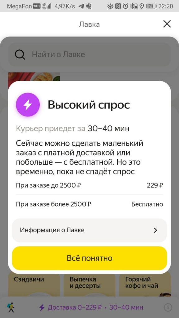 В "Яндекс.Лавке" также подняли минимальную стоимость заказа. В некотрых районах она выросла до 2500 рублей. При этом стоимость доставки маленьких корзин составила 229 рублей.