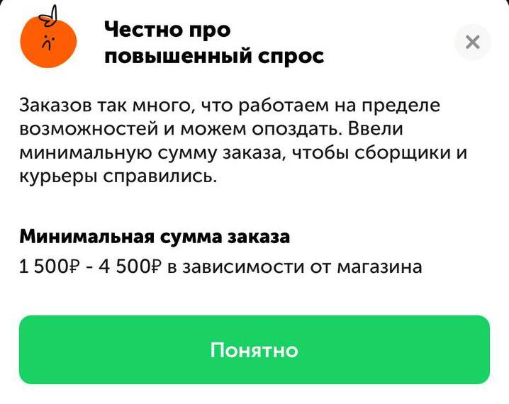 В сервисе "Самокат" минимальная сумма в приложении днём для Москвы тоже повысилась и составила 1000 рублей. При этом заказчиков из Москвы и Нижнего Новгорода предупреждали, что заказ может сильно опоздать.