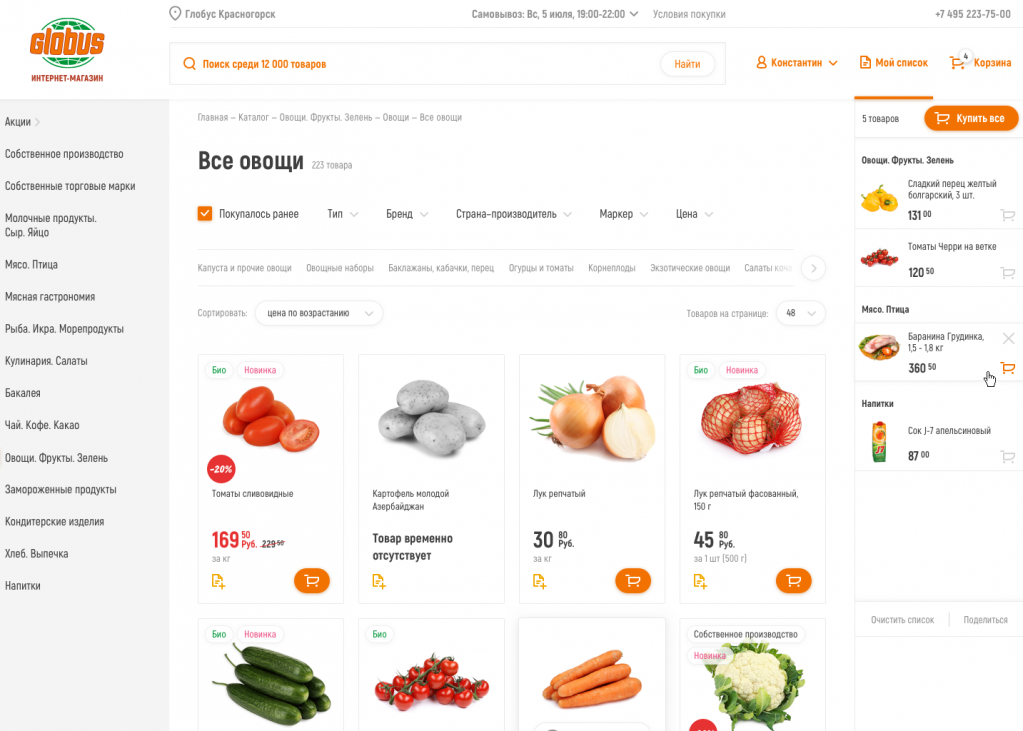 ВА: Поведение покупателей в магазинах разных сегментов отличается кардинально. В магазин бытовой техники ты целенаправленно идешь, к примеру, за чайником и можешь положить в корзину максимум 2-3 товара (прихватив к чайнику какую-то мелочь вроде батареек или будильника). А в продуктовый гипермаркет не ходят просто «за хлебом». Там мультикатегорийная корзина, она может состоять из нескольких десятков товаров. Чтобы покупателю было удобно «путешествовать» по категориям каталога, мы зафиксировали навигационное меню слева, а корзину и списки покупок справа.