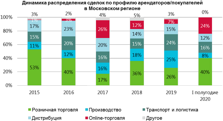 По данным JLL, драйверами спроса на складском рынке в текущем году стали сегменты продуктового ритейла (30% от общего объема сделок), eСommerce (26%), компании секторов дистрибуции и логистики (33%).