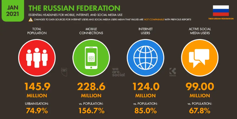 - Digital 2021 (февраль): В России доступ к интернету имеет 85% всего населения - 124 миллиона человек.