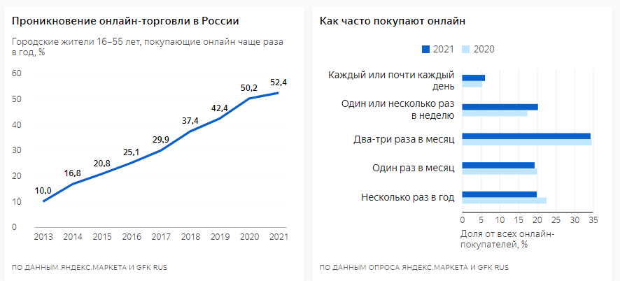 - "Яндекс.Маркет"/GfK (декабрь): 52,4% россиян в возрасте 16-55 лет покупает что-нибудь в интернете минимум два раза в год. 80% онлайн-покупателей заказывают что-то минимум раз в месяц, 26% - минимум раз в неделю.