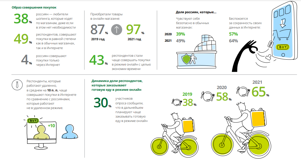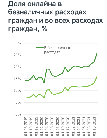 - "СберИндекс" (декабрь): В третьем квартале 2021 года 21% от всех безналичных оплат были совершены в интернете. Доля покупок граждан, совершенных в экосистемах, растёт самыми высокими темпами: в первом квартале 2020 года они составляли всего 1% от всех безналичных трат россиян, а в третьем квартале 2021 года уже 3,5%. Доля безналичных платежей в торговом обороте России в ноябре составила 61,8%