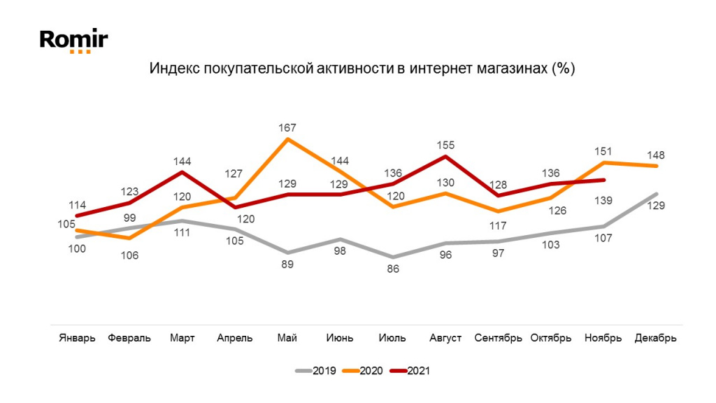 "Ромир" (ноябрь): Индекс покупательской активности в интернет-магазинах к ноябрю 2021 года вырос до 139%. Это меньше, чем год назад. 2021 год при этом отличается большей стабильностью, отражающей сформировавшиеся паттерны покупательского поведения.