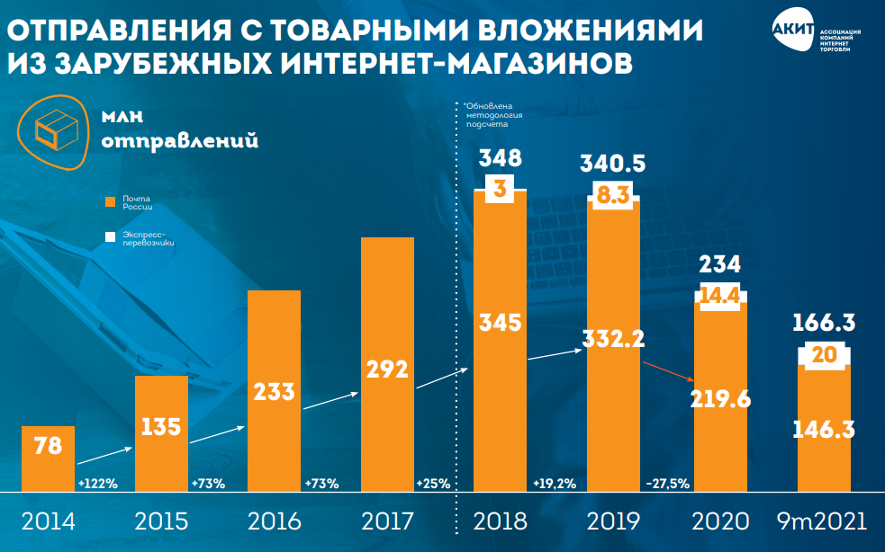 - Ассоциация компаний интернет-торговли (АКИТ) (ноябрь): Объем рынка трансграна по итогам 9 месяцев 2021 года составил 341 млрд. рублей или 166,3 млн посылок. Доля трансграничной торговли сократилась до 14%