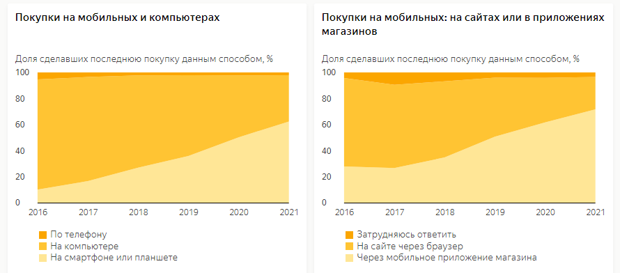"Яндекс.Маркет"/GfK (декабрь): Доля покупок, сделанных с мобильных устройств, превысила 60%. Покупая на мобильных, люди всё чаще пользуются приложениями магазинов, а не их сайтами.