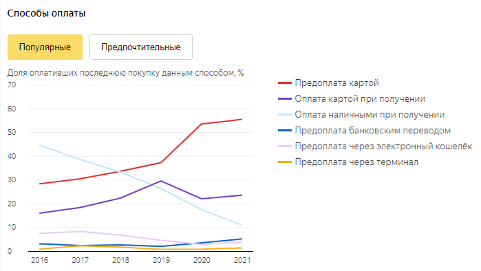 - "Яндекс.Маркет"/GfK (декабрь): 55% оплатили свою последнюю покупку банковской картой при оформлении заказа. 23,5% рассчитались картой при получении.