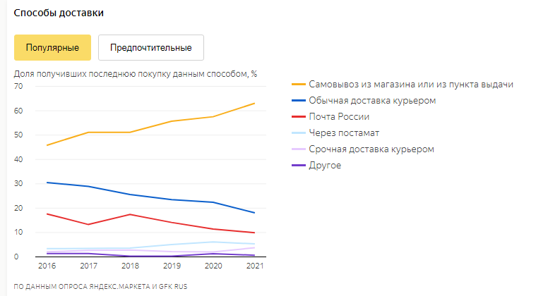 - "Яндекс.Маркет"/GfK (декабрь): 62,5% россиян пользуются самовывозом из магазина или пункта выдачи. На втором месте — доставка курьером (17,9%), на третьем — почта (9,8%).