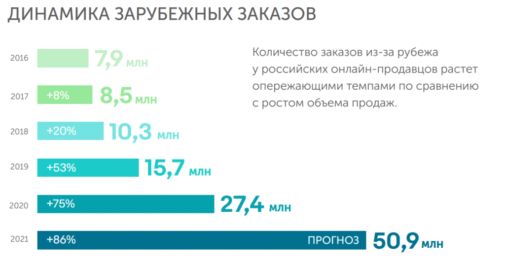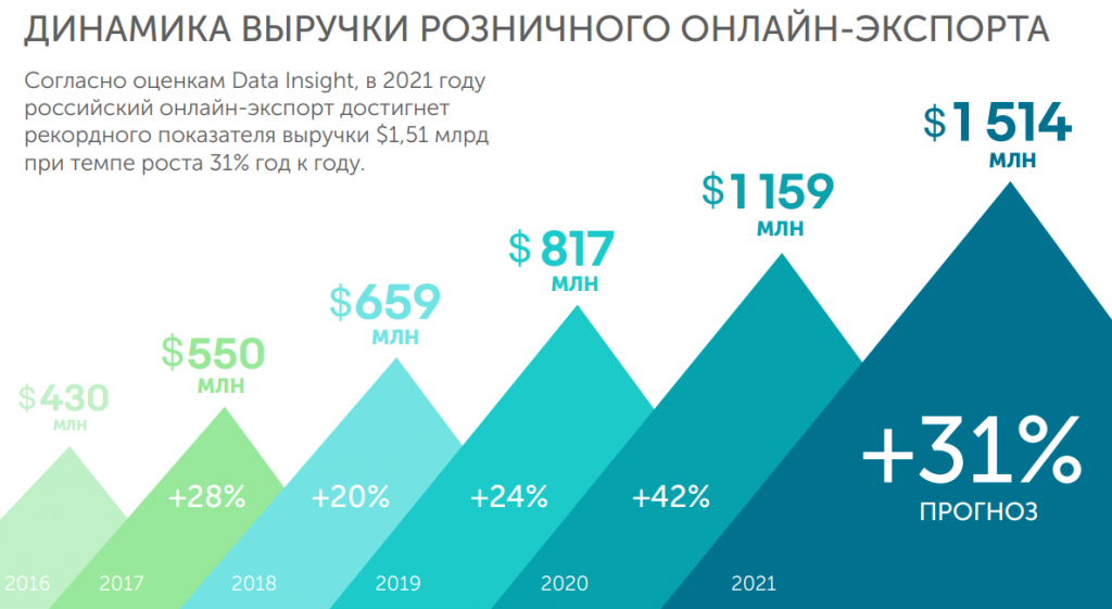 - eBay/Data Insight (декабрь): Рынок розничного онлайн-экспорта товаров из России в 2021 году достигнет $1,51 млрд, а его рост составит 31%. По итогам года число посылок, отправленных за рубеж, составит 50,9 млн, увеличившись на 86% по сравнению с прошлым годом. В 2021 году эксперты отмечают снижение общего среднего чека с $42 до $32.