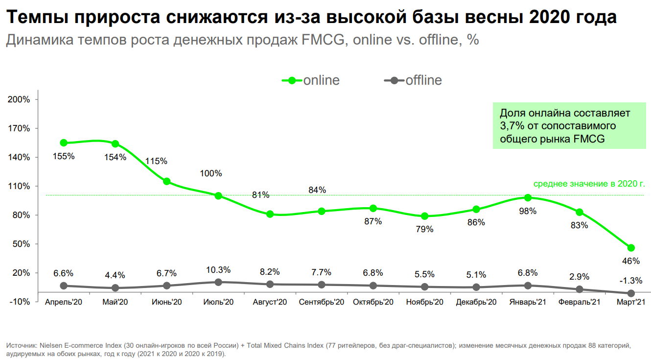 Как рассказал руководитель направления онлайн-ритейла компании NielsenIQ Александр Шуркаев, пока ещё точно не известно, сколько будет длиться это замедление роста, однако уже можно видеть его начало: в феврале темпы роста онлайна упали до 83%, в марте - до 46%.