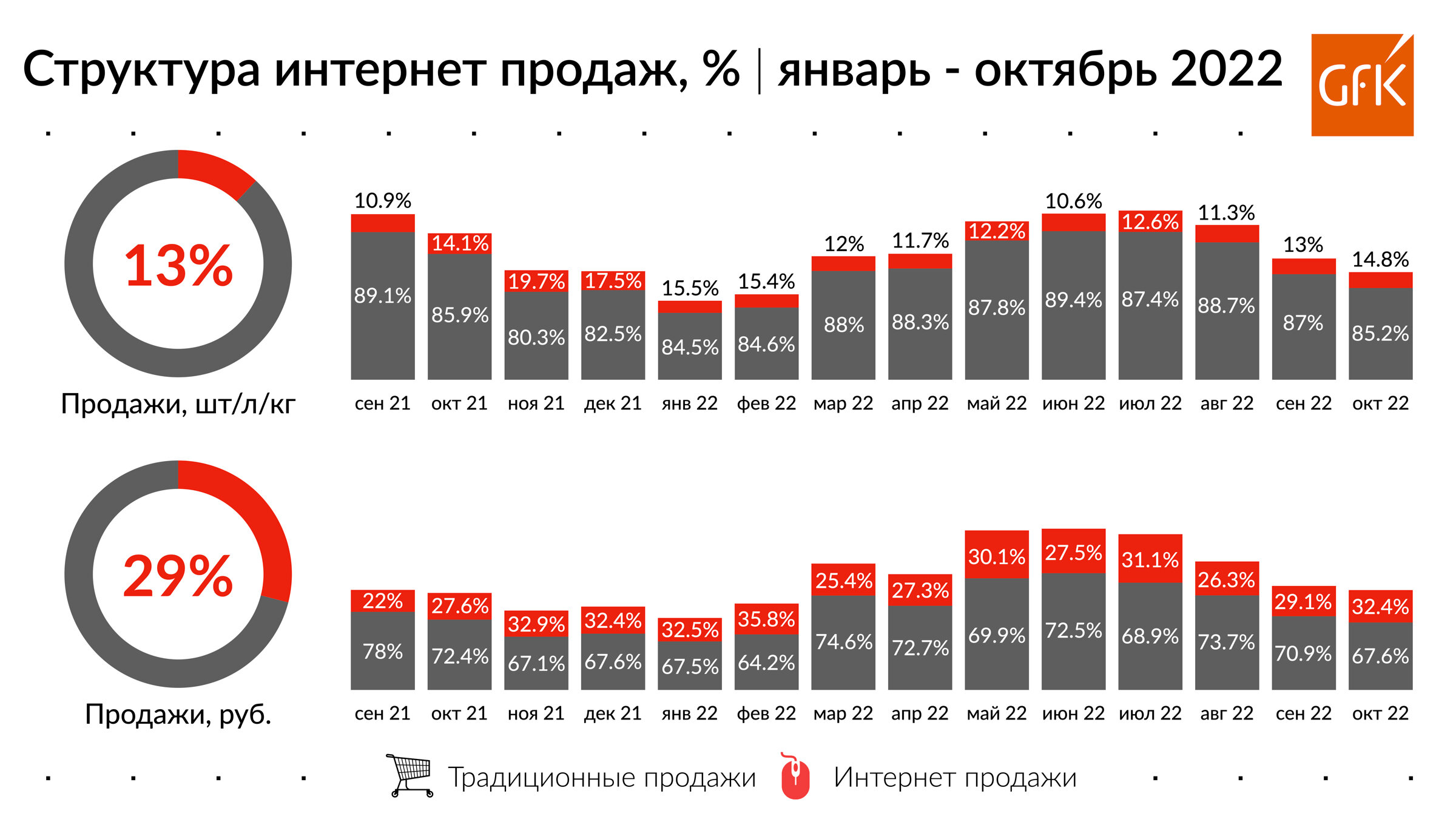 Ассоциация компаний интернет-торговли (АКИТ) (ноябрь): за 9 месяцев на российских онлайн-площадках жители страны потратили на 43% больше, чем год назад. Общий объем продаж интернет-торговли в России за 9 месяцев 2022 года преодолел планку в 3,5 трлн рублей. Доля интернет-торговли в общем объёме розничных продаж за 9 месяцев 2022 года составляет 11,2%. Год назад за тот же период доля была на уровне 9%.