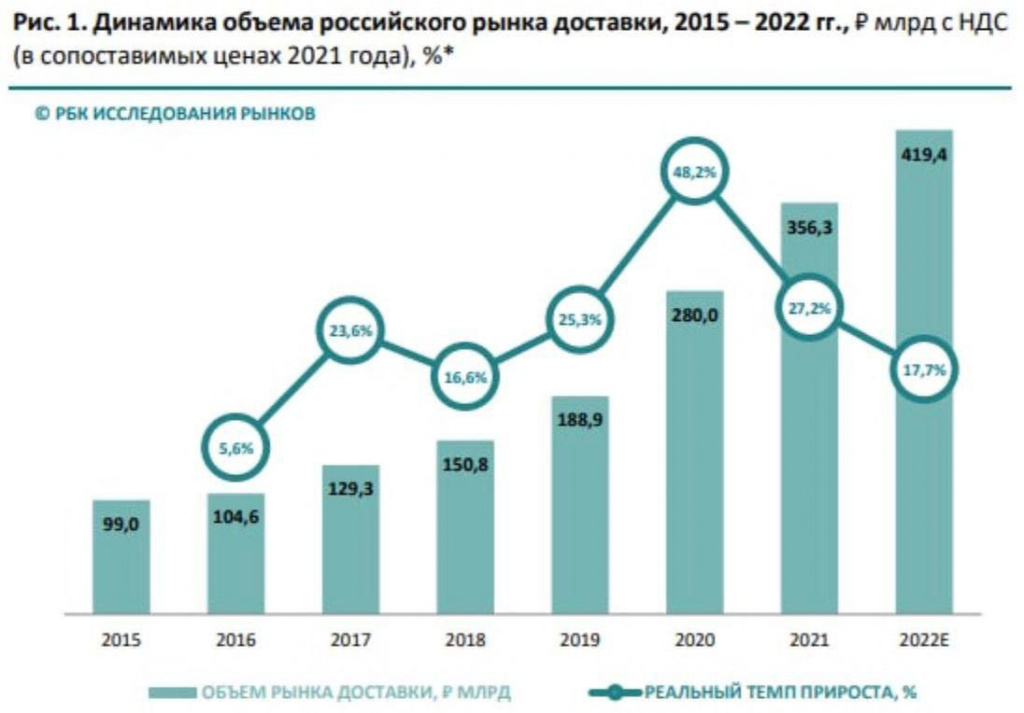 - "РБК Исследования рынков": объем российского рынка доставки составит 419,4 млрд рублей. Реальный темп прироста будет 17,7%.