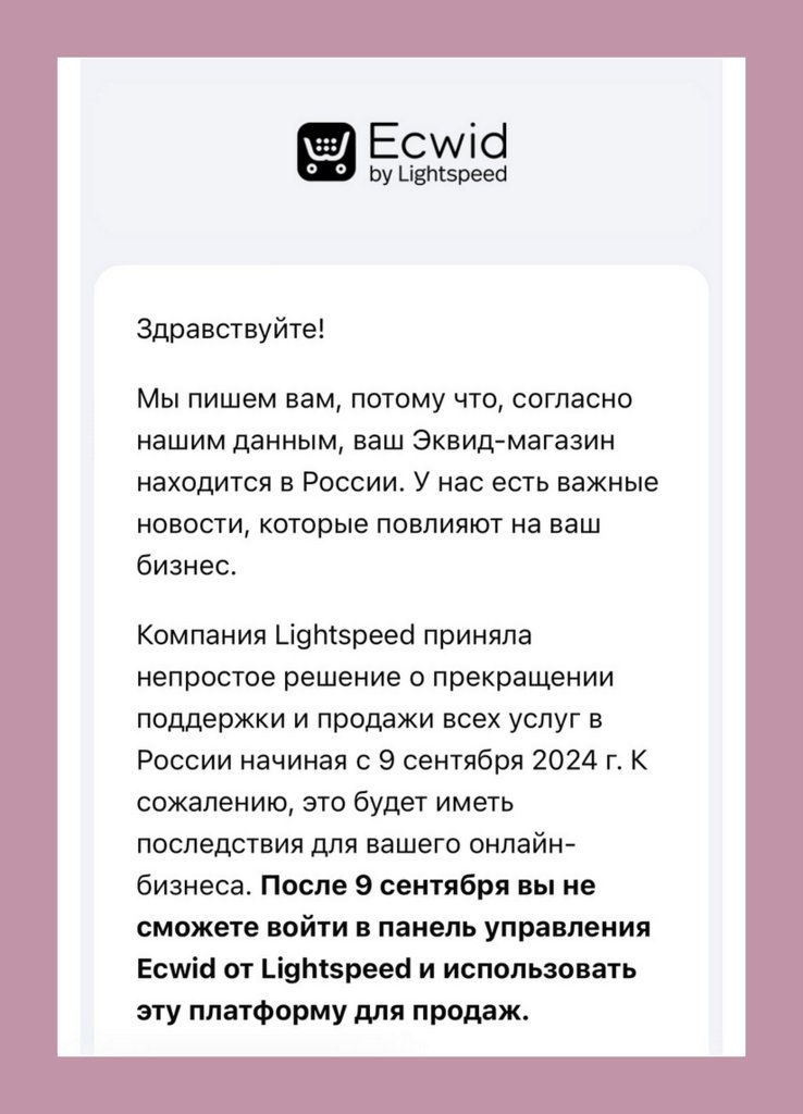 Пользователям Ecwid из России рекомендуется перейти на другие платформы электронной коммерции до 9 сентября.