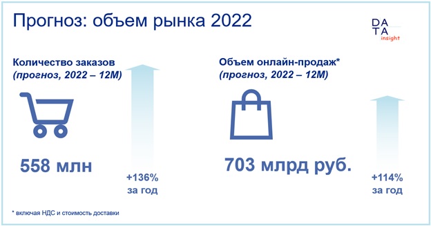 Data Insight предполагает, что темпы роста eGrocery в 2022 году несколько снизятся – но он все равно вырастет более чем в 2 раза и останется самым быстрорастущим сегментом рынка электронной торговли. По итогам 2022 года мы ожидаем, что рынок eGrocery достигнет 558 млн заказов (в 2,4 раза больше, чем в 2021 году) и 703 млрд рублей (в 2,1 раз больше, чем в 2021 году).