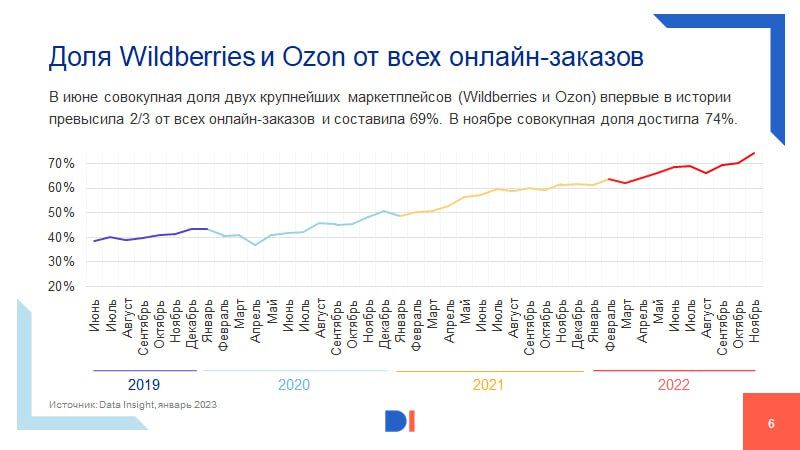 Data Insight даёт гораздо более оптимистичные для маркетплейсов цифры. По их данным, к ноябрю доля двух крупнейших МП достигла 74%. В сумме Ozon и WildBerries выросли за год в количестве заказов на 106%.