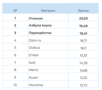 Больше всего очков в этом рейтинге получил магазин "Утконос", набрав 23,03 балла. На втором месте — "Азбука вкуса", набравшая 19,49 балла. В тройку лидеров также вошёл магазин "Перекрёсток" с показателем 19,41.