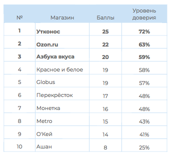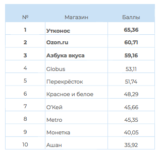 В тройку лидеров рейтинга вошли "Утконос", Ozon.ru и "Азбука вкуса", получившие 25, 22 и 20 баллов соответственно.