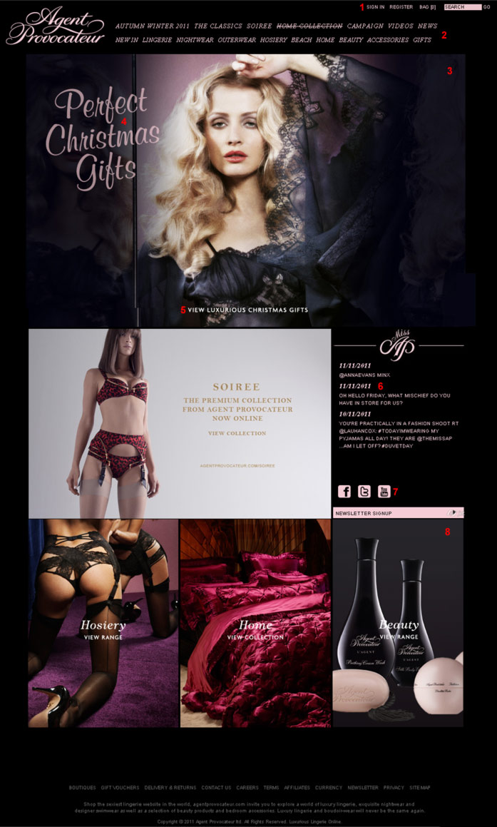 8 - Весьма противоречивые мысли возникли насчет этих трех блоков. По нашему мнению, главная страница сильно перегружена картинками товара и мешает посетителю сосредоточится на чем-то конкретном. Может быть есть смысл "спрятать" их в блок с Soiree The Premium Collection и сделать его активным со сменяющимися блоками внутри при наведении курсора мыши?
