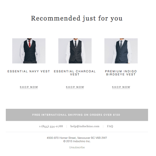 Бренд Indochino подгоняет мужские костюмы под фигуру каждого покупателя. Марка анализирует покупки клиентов и собирает для каждого из них письма с персональными скидками - например, подборку из трёх рубашек, подходящих под недавно купленный костюм.