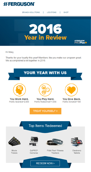 Дистрибьютор сантехнических принадлежностей Ferguson посчитал количество бонусов клиентов - заработанных, потраченных и пожертвованных на благотворительность - и отправил в письме.