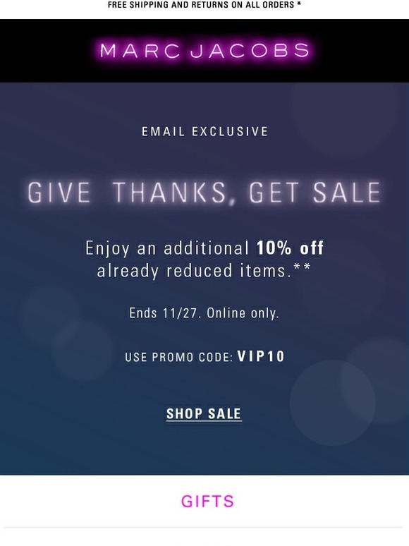 MarcJacobs в имэйлах приглашает постоянных клиентов на эксклюзивные онлайн-распродажи.