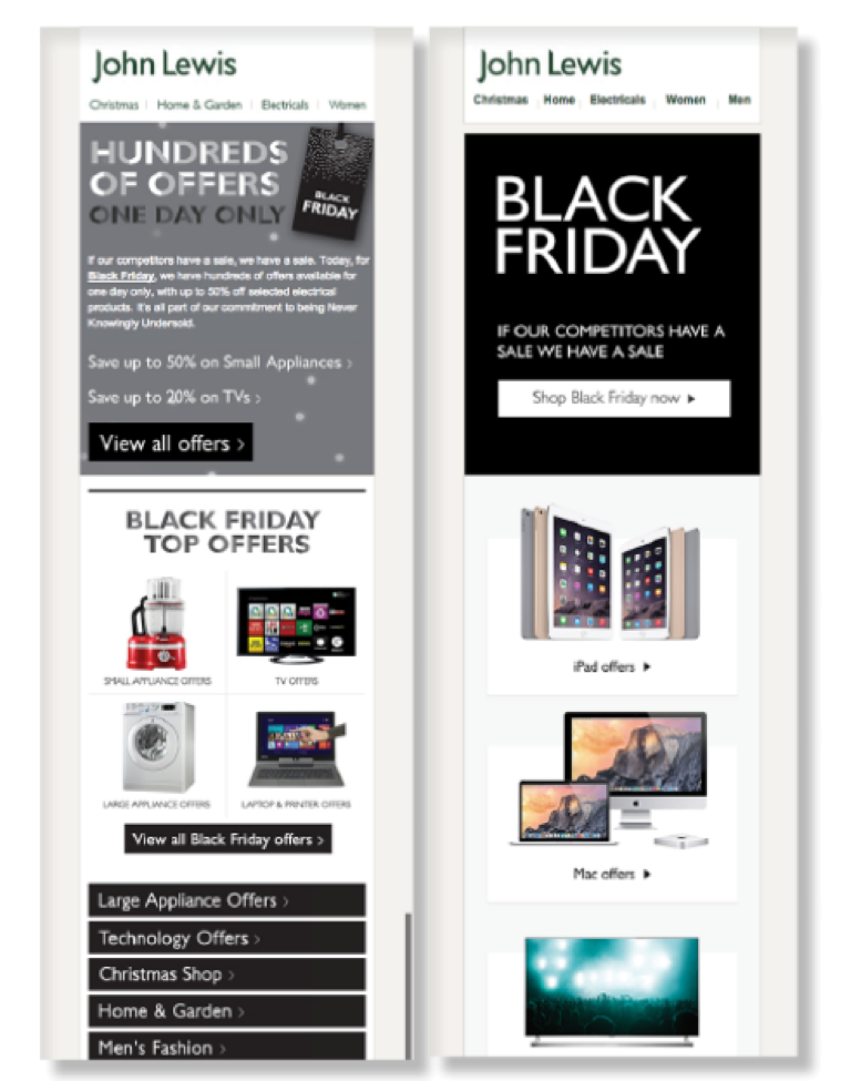 На иллюстрации изображён пример от Джона Льюиса: вторая версия страницы демонстрирует появление все более простых сообщений, избавление от элементов сложного дизайна и детализированных рекламных текстов.