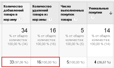 Добавление / удаление товара в / из корзины. Тут вопросов не возникает, в отчете вы получите информацию о том какой товар сколько раз был добавлен в корзину и сколько раз его удалили из нее:
