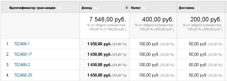 Транзакция описывается практически так-же как и обычная электронная торговля Google Analytics.
