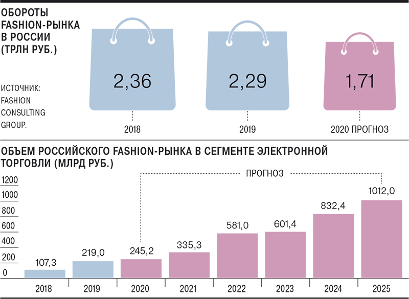 По данным Fashion Consulting Group, суммарный объем фэшн-рынка в России сократился по итогам 2020 года на 25% и составил 1,7 трлн рублей. При этом интернет-продажи в сегменте одежды и обуви увеличились за это же время на 11% и составили 245,2 млрд рублей. В 2025 году этот показатель может превысить 1 трлн рублей, уверены аналитики.