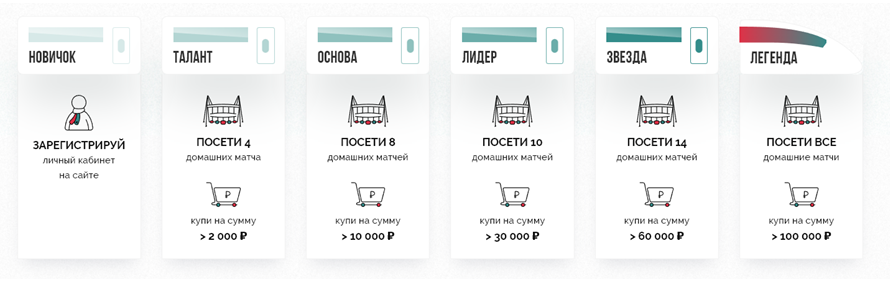 Программа лояльности включает поощрения болельщиков в зависимости от их активности. По ходу спортивного сезона участники программы получают один из шести статусов:
