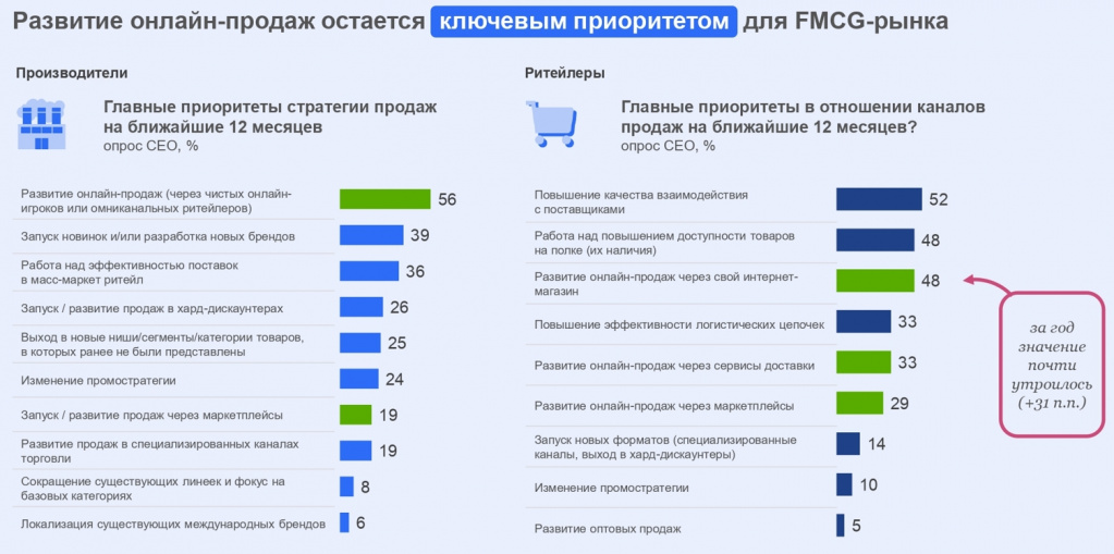 Российские производители и продавцы товаров повседневного спроса все активнее осваивают онлайн-торговлю. Согласно исследованию Nielsen, проведенному среди топ-менеджеров FMCG-компаний, почти треть респондентов ожидают роста своего бизнеса более чем на 15% в 2025 году. Это вдвое больше, чем годом ранее.