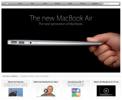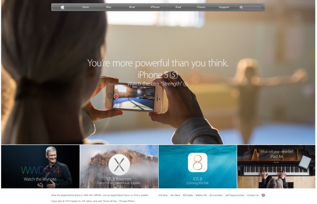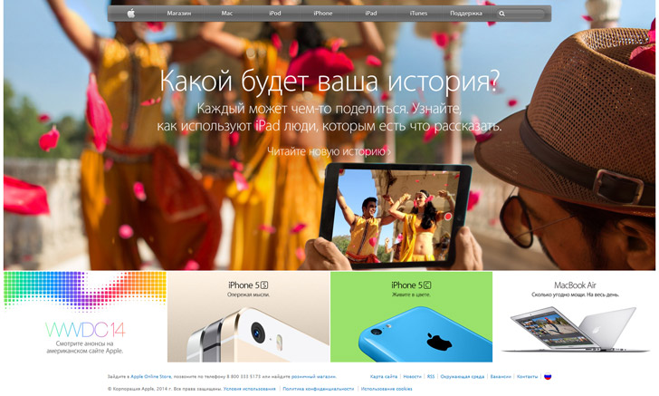 Очевидно, что Apple хочет, чтобы как можно большее количество пользователей узнало об их iPhone 5S. Одно большое изображение продукта в слайдере с мотивационными призывами, благодаря которым компания хочет продвинуть его, и внизу четыре дополнительных картинки, связанных с компанией и особенностями ее продуктов. Это американская версия сайта. Давайте посмотрим на русскую? Заметили разницу? Суть в том, что скорее всего, на американском рынке (а значит и в английской версии сайта) Apple уже исчерпала запас интереса аудитории к некоторым продуктам из своей линейки, поэтому предлагает ей более погрузиться в информационную среду, создаваемую вокруг товаров. В России же запас еще не достиг своего предела и помимо iPhone 5 серии также предлагаются ноутбуки. Версия подтверждается и тем, что раньше, когда компания продвигала MacBook Air, там была картинка сопровождается четырьмя маленькими изображениями ниже, три из которых, непосредственно, связаны с продвигаемым продуктом.