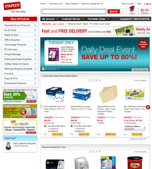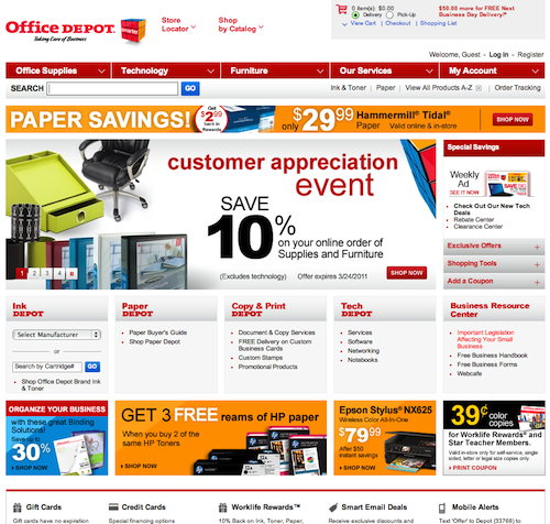 Есть ли на вашей главной странице ссылки на категории или товары? Как обсуждалось выше, главные страницы крупных интернет-магазинов быстро загромождаются. Поэтому давайте более подробно обсудим два разных подхода, которые выбирают крупные интернет-магазины для своих главных страниц. В качестве примера категории vs товары рассмотрим OfficeDepot.com и Staples.com (эта тенденция ни в коем случае не ограничена рынком “канцелярских товаров” - прим. ред.).OfficeDepot