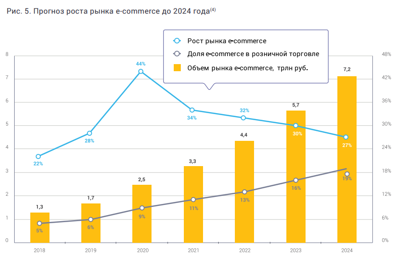 Рынок фулфилмента в России в 2019 году составил 15 млрд рублей. Всего было обработано 65 млн отправлений. К концу 2020 года объём рынка достигнет 27,5 млрд рублей, что соответствует 109 млн отправлений. Такие данные содержатся в новом исследовании рынка фулфилмента от Data Insight. Аналитики прогнозируют средний рост российской интернет-торговли с 2019 по 2024 год (CAGR) 33%.