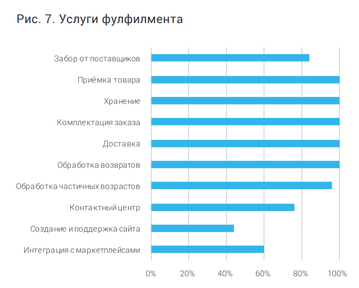 Практически все операторы, представленные на рынке, предлагают интернет-магазинам также доставку. Как минимум 80% из них располагают собственной курьерской службой, хотя бы в одном городе. Каналы доставки могут быть разные — до двери, в пункт выдачи заказов или постамат. Подготовку товаров для передачи на маркетплейсы предоставляют как минимум 60% операторов, коллцентр — более чем 75%.
