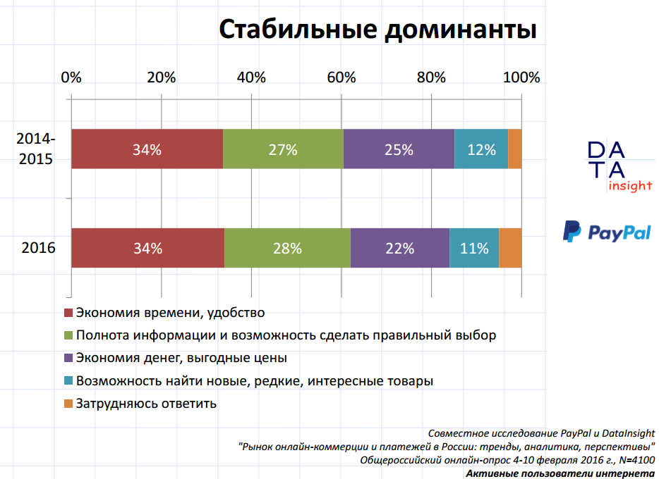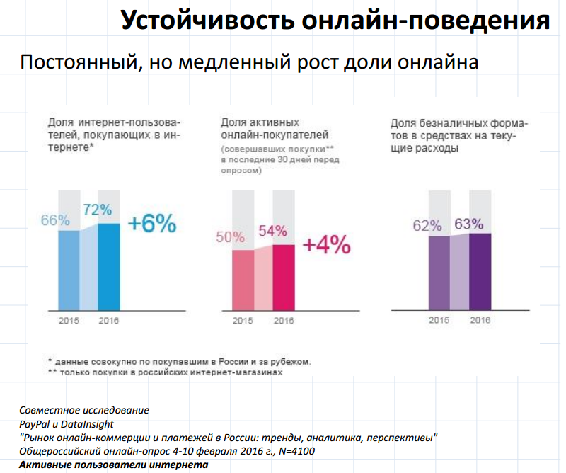 Ещё одной точкой роста в 2016 году становятся сами интернет-пользователи. Они приобретают опыт покупок в Сети. Если в 2010 году медианный онлайн-стаж у них был менее 3 лет, в 2013 г. – около 4 лет, сейчас – более 6 лет. Соответственно, такие покупатели уже не боятся онлайн-шопинга и оплаты в интернете, у них нет психологических барьеров.