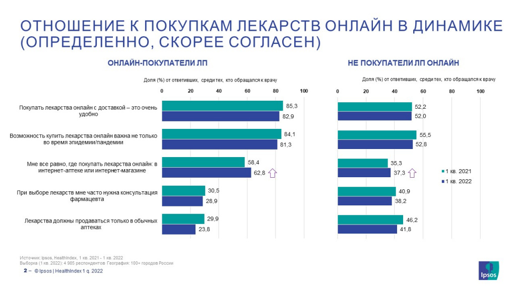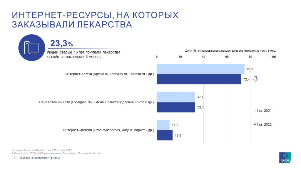 Доля россиян, покупавших лекарства онлайн в I кв. 2022 года, уменьшилась относительно уровня IV кв. прошлого года с 25% до 23%, говорится в исследовании компании Ipsos HealthIndex за I кв. 2022 года.
