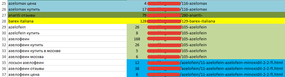 Получился список запросов, с которым нужно работать дальше (расширять, дополнять, кластеризовать), а часы тикают, и на то, чтобы составить список «запрос-страница» ушло бы еще часов двадцать. А после – еще большее количество времени на создание нужных посадочных страниц и переноса туда товаров.